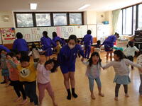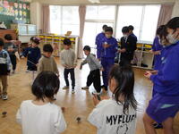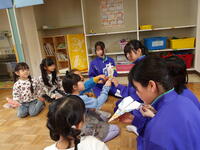 幼児との触れ合い体験で訪問した園では、駒回しやお手玉、紙飛行機飛ばしなどを楽しんでいました。訪問後、布を使った製作のあまり布で、お手玉を作ってプレゼントしました。