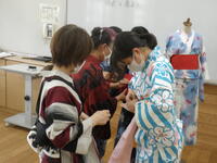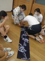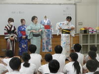 外部講師を招いて「浴衣の着付け」を学習しました。和服の部分名称や男女の着方の違いの講義後、実際に浴衣を着用しました。着用後には、収納の仕方も教わりました。運動会では、3年生全員が浴衣を着て、地域の盆踊りを踊りました。